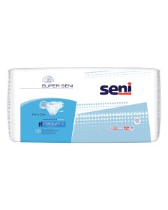 Seni Super Seni est une gamme de changes complets avec attaches pour les utilisateurs à mobilité réduite ou dépendants. Sa forme anatomique offre un ajustement parfait qui s’adapte à toutes les morphologies pour plus de sécurité, renforcé par des protections anti-fuites latérales sure. Sans latex, cette protection munie de la technologie « Extra Dry System » absorbe très rapidement. Un indicateur d’humidité informe de la saturation de la couche.